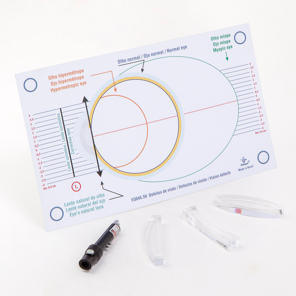 CARACTERÍSTICAS: Conjunto Defeitos de visão com: dióptro plano-côncavo, (lente), dióptro bi-convexo, (lente), dióptro plano-convexo, (lente), painel defeitos de visão e lanterna laser, um feixe