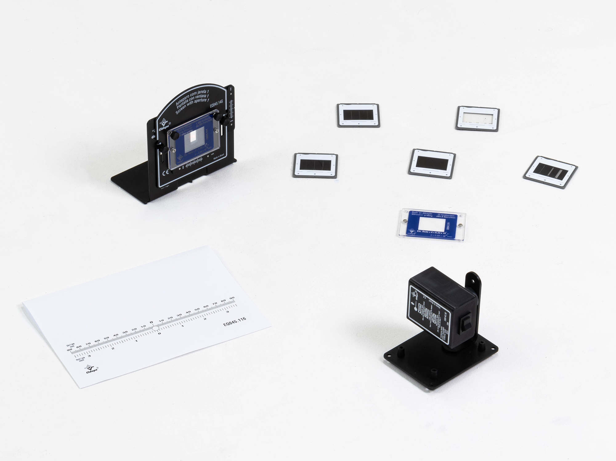 Conjunto difração discreta da luz e comprimento de onda com laser e suporte retangular, básico, lanterna de um feixe laser com adesão lateral, luz visível, 5 mW, comprimento de onda 665 (±15) nanometros, chave On-Off, fonte de alimentação pilhas, afastador lateral de adesão magnética encapsulado, base retangular com suporte em L, em aço revestido em epoxi pelo processo eletrostático, quatro sapatas antiderrapantes e L alinhador para lanterna, escala linear impressa, em milímetros e polegadas, com zero central, anteparo com janela 1, aço revestido em epoxi com indicações serigrafas, 100 x 111 mm, oblongos alinhadores, apoio horizontal com escala de 10-0-10 mm, divisão de 1 mm, janela central e esperas para fixações, rede de difração, constante de rede 8,33 x 10E-5 m, 12 fendas/mm, proteção contra UV com serigrafia identificadora, área 70 x 50 mm e orifícios para fixação, rede de difração, constante de rede 1,00 x 10E-6 m, 1000 fendas/mm, proteção contra UV com serigrafia identificadora, área 70 x 50 mm e orifícios para fixação, máscara com 3 fendas diferentes, adesão magnética, fenda 0,2 mm, fenda 0,4 mm e fenda 0,6 mm, máscara com 3 séries de 2 fendas, adesão magnética, fendas de 0,2 mm com afastamento de 0,2 mm, 0,4 mm e de 0,6 mm, máscara com 3 séries com número diferentes de fendas, adesão magnética, série com com duas fendas, série cinco fendas e série dez fendas, máscara com círculos opacos diferentes, adesão magnética, círculo com diâmetro 0,2 mm, diâmetro 0,5 mm e diâmetro 1 mm, máscara com círculos de passagem diferentes, adesão magnética, círculo de diâmetro 0,2 mm, de diâmetro 0,5 mm e de diâmetro 1 mm e cavaleiro sem aba com dois manípulos e escala, aço revestido em epoxi e serigrafia, base com fixação magnética, oblongos laterais, indicadores de posição e escala 10-0-10 mm com divisão de 1 mm.